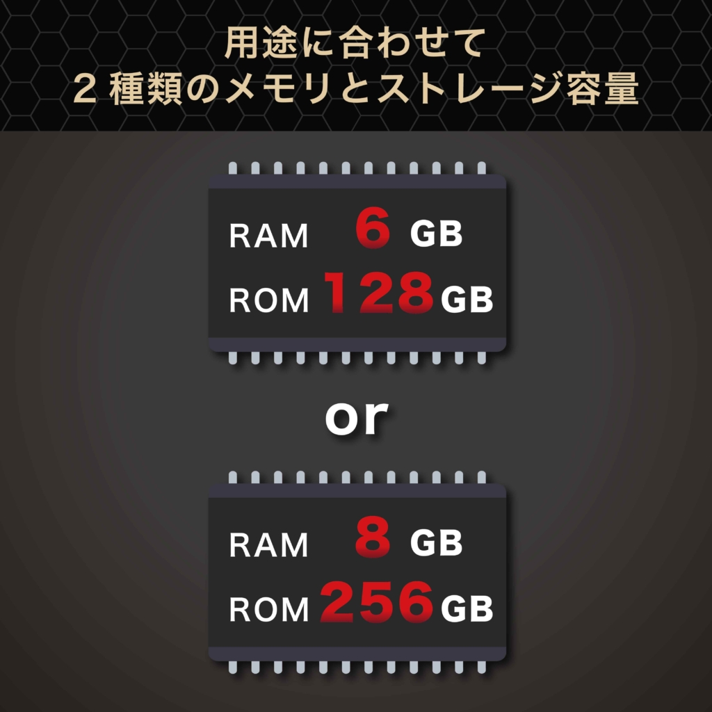 写真や動画、アプリをたくさん保存できる『RAM 6GB / ROM 128GB』構成と、より大容量のデータやアプリ動作の安定性を求める方におすすめな『RAM 8GB / ROM 256GB』構成の2種を展開。